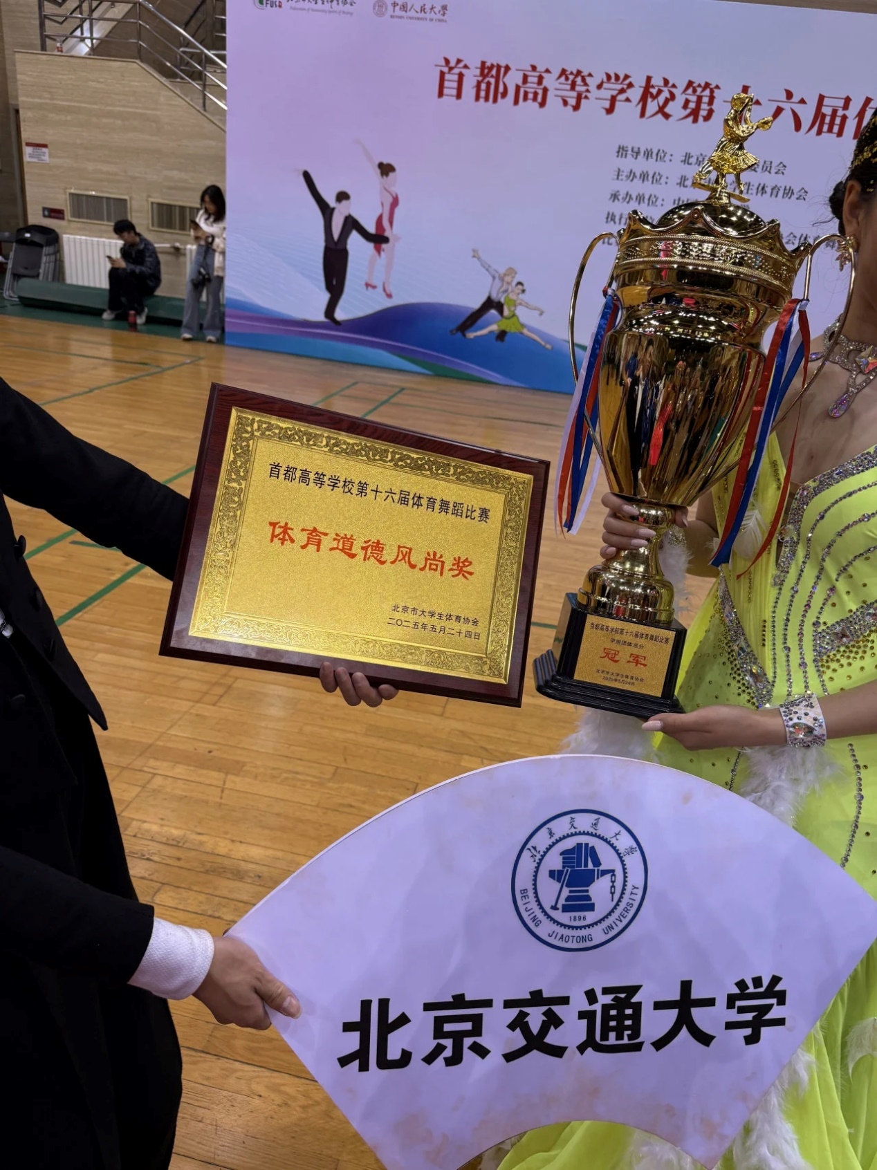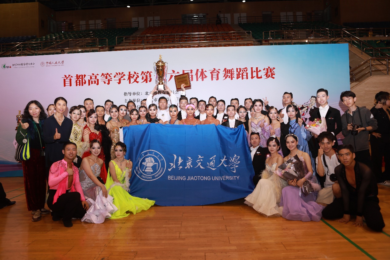 2025年5月24日,由北京市大学生体育协会主办的首都高等学校第十六届体育舞蹈比赛在中国人民大学圆满落幕。交大体育舞蹈队40名队员在领队赵暘,教练员周艳茹、姜鹏的带领下参赛,并以389分的总分,再次斩获首都高校体育舞蹈比赛团体总分第一名,夺得18金,14银,5铜,满载而归!