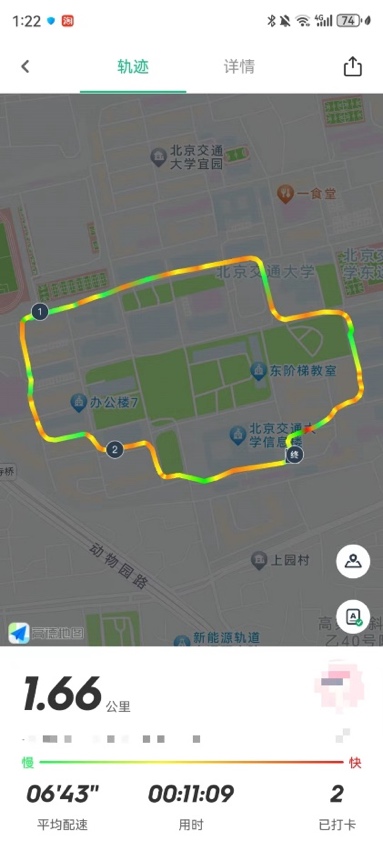 每次最少跑步距离:男生2公里,女生1.6公里(每次至少经过两个打卡点)